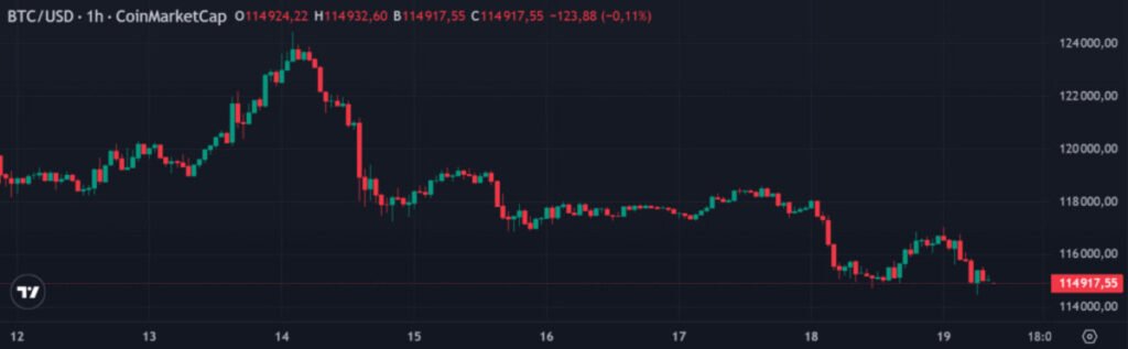 Despite the pullback, both Bitcoin and Ethereum remain far above where they were earlier this year. Bitcoin, which recently hit record highs above $124,000, is now testing critical support zones at $115,000 and $114,000.